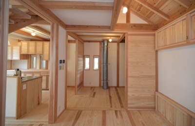床下換気を外気側に換気口を設けず、建物の室内側の床面に換気ガラリなどを設ける、基礎断熱をした住宅(床下空間を外気ではなく室内と同じような温湿度環境にしようとする考え方の住宅)の床下空間の気温は、夏期で15℃〜22℃、23℃ぐらい、冬期で15℃〜9℃、8℃ぐらいです。夏はこの少しヒンヤリした空気を、ロフトや吹き抜けの上部にダクトに接続したファンで送り込み、開放することで、自然に下方に向かって拡散し、家全体が少し涼しくなります。冬、暖房使用時は、やはりロフトや吹き抜け、天井面に近い部分に温度の高い空気が溜まりがちになるので、ファンを逆回転させることで、温かい空気を床下空間に送り込むことにより、床面の冷たさの緩和になります。家の中で偏在し使えなくなってしまっている熱量を循環させることで、温度ムラの少ない快適なおいしい空間が生まれます。