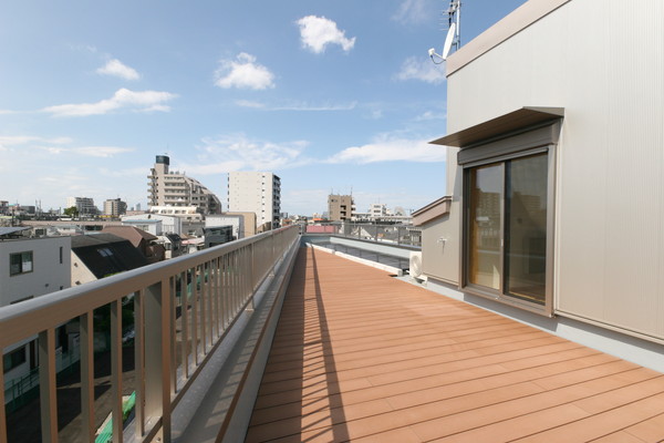 再生木のデッキを敷いた、広いルーフバルコニー。