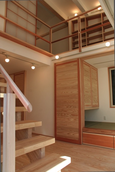 吹抜けを介して、2階の板の間部分の本棚が見える。