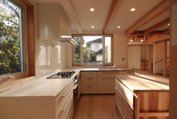 庭に面した窓の有る、明るいキッチン。