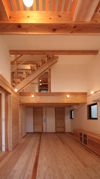 吹抜けの中を上る階段。