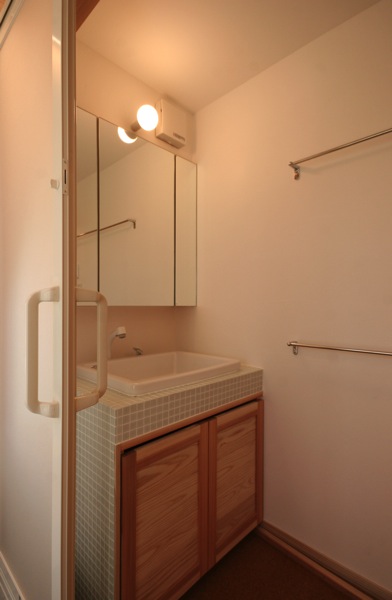 1階洗面室とはで在位を変えて、シンプルなガラスモザイクで、仕上げている。
