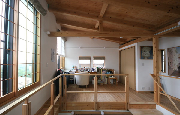 吹抜け越しに見た仕事スペース。