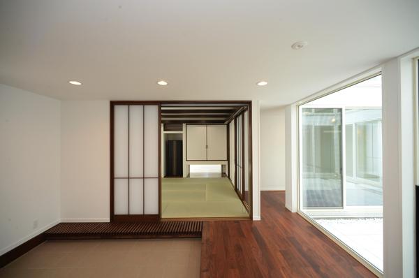 式台のある玄関から続く、モダンな障子で仕切られた和室(仏間)を望む。