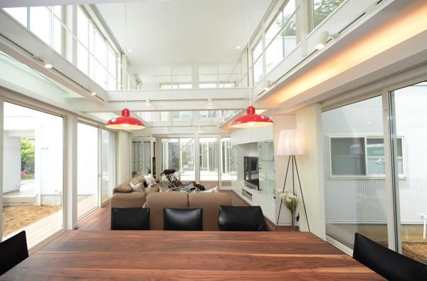 手前の食卓は、ウォールナット材で造作した、オリジナルのダイニングテーブル。
