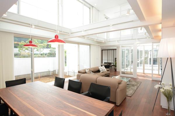 仕上げた壁に囲われた、プライベートな庭に続いている。