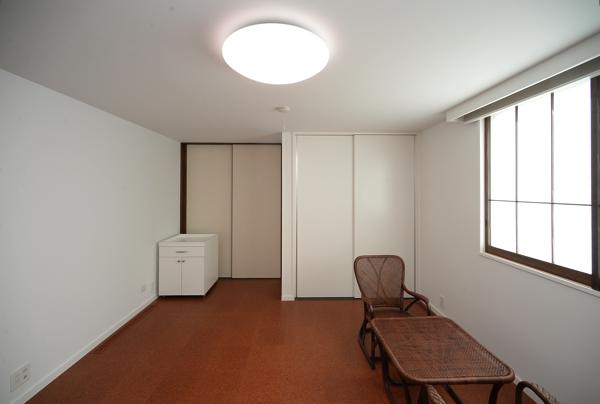 白い壁と天井に、床は濃い目のコルクタイルで仕上げている。