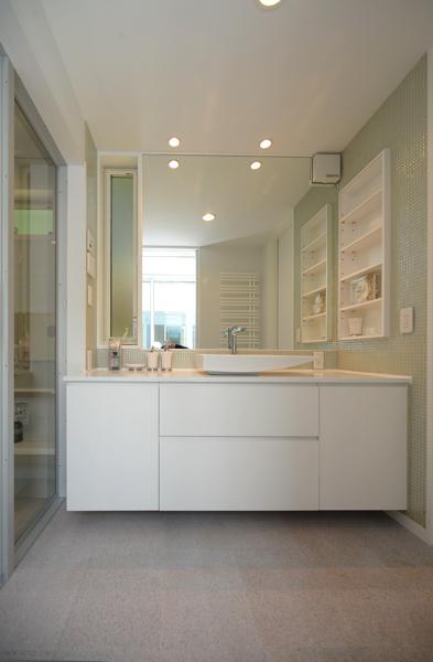 床仕上げは白のコルクタイルとし、壁にはモザイクタイルを使用している。