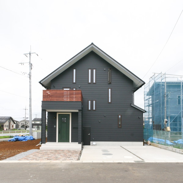 バルコニーの木製手すりがアクセントになっている。