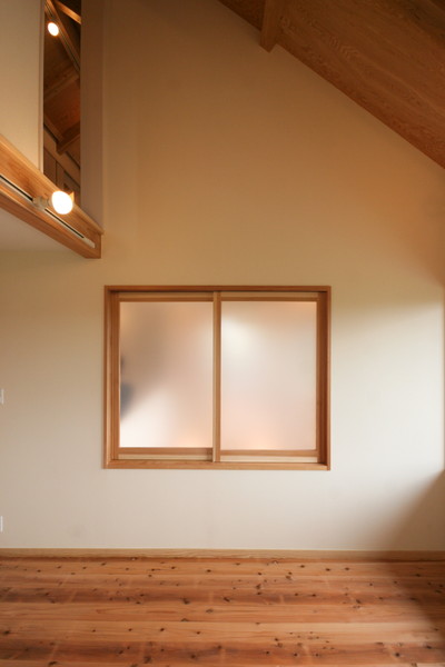 床は無垢杉材、壁は漆喰塗り、天井は構造用合板あらわし。