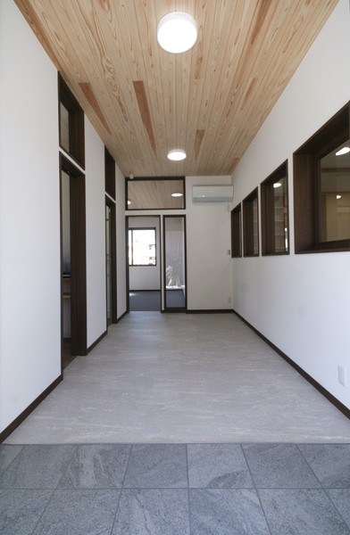 玄関部分の床はタイル仕上。廊下部分はフロアータイル仕上。