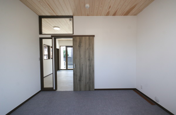 廊下の天井杉板と連続している、打合せ室の杉板天井。