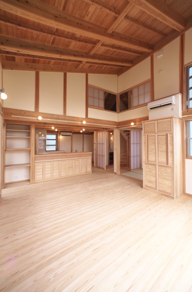 登り梁を現わしにして、屋根の形状を室内に