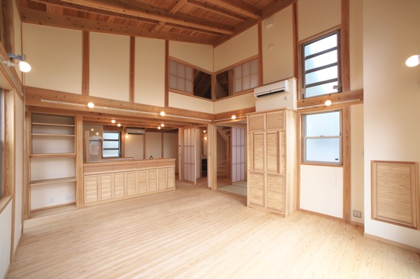床と天井は杉の無垢材、壁は漆喰塗りとし、自然素材で仕上げた
