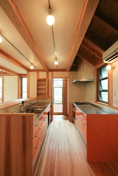 オレンジ色のシステムキッチンがアクセントになっている台所。