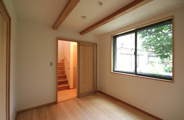杉のフローリングと、杉の柱・梁とバランスよく調和している。