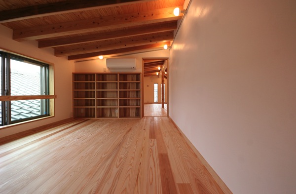 譜面も収納できるように、サイズを調整した本棚を持つ小屋裏収納。