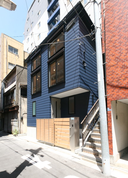鮮やかな濃紺色のヨコ張りの金属サイディングの外壁。