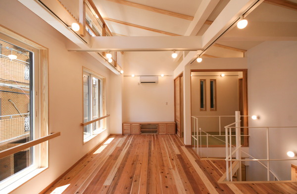 床は無垢杉材、壁は漆喰塗り、天井はペンキ塗装仕上げ。