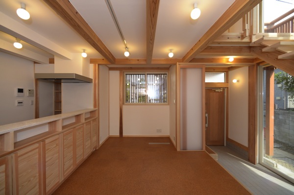 床の仕上げはコルクタイル貼り、壁の仕上げは漆喰塗り、天井の仕上げはペンキ塗装。