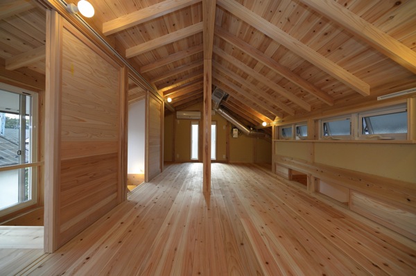 床は杉の無垢フローロング、天井は杉の縁甲板による仕上げとなっている。