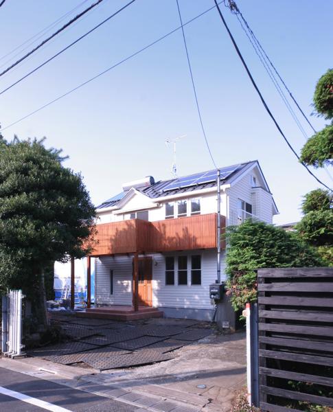 白のガルバリウム鋼板で、下見張り調のデザインによる、洋館風の外観が特徴の住宅。