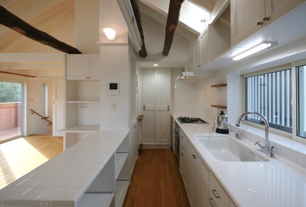 リビングとのカウンター天板は、白いタイルで仕上げている。