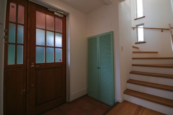 ペパーミントグリーンの扉が、玄関のアクセントになっている。