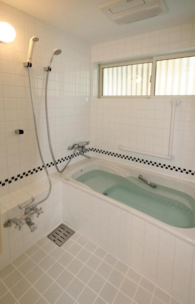 壁と床の仕上げはタイル貼り。壁面アクセントの市松模様は、洗面脱衣室と共通のデザイン。