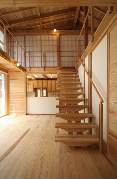 杉の力桁と段板による階段。