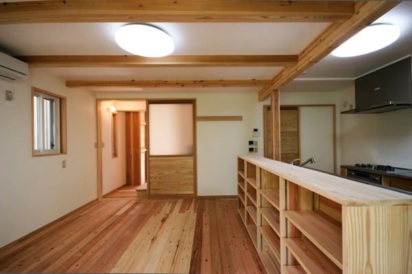 床は無垢の杉材、壁は漆喰塗り、天井はペンキ塗装によって仕上げている。