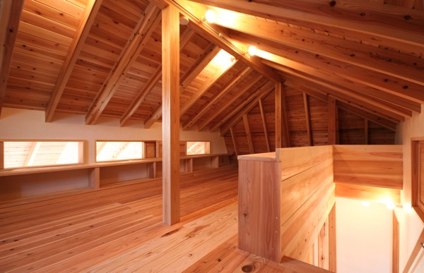 山小屋のような切妻屋根に覆われた、落ち着いたロフト。