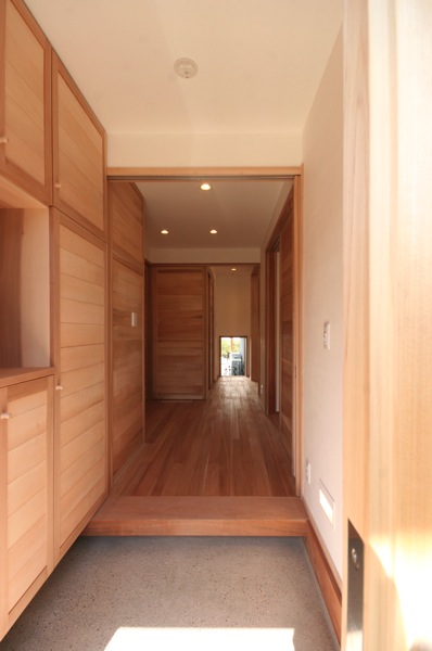 ホールの床、建具の材料には「桂材」を使用。