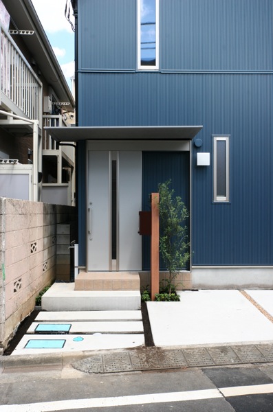 引戸の玄関扉と、シャープで大きな玄関庇が特徴の玄関回り。