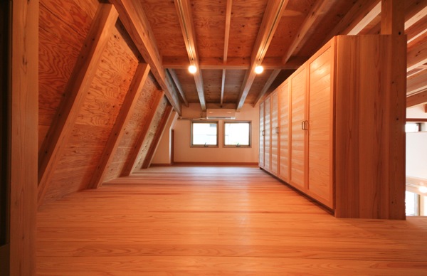 床は無垢の杉材、壁は漆喰塗りとし、天井は構造用合板による仕上げとしている。