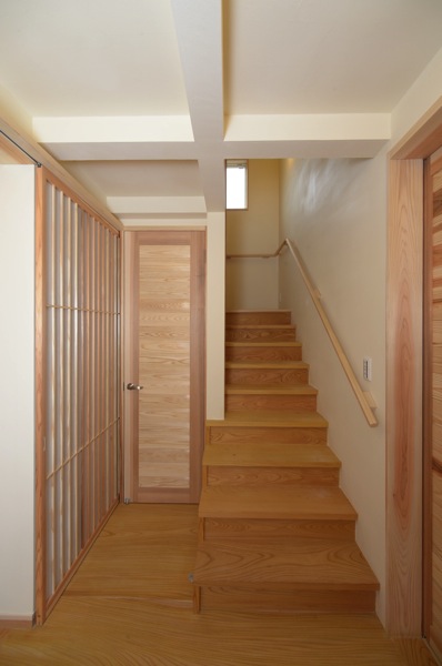 階段、玄関ホールの床は、ケヤキの無垢材によるもの。
