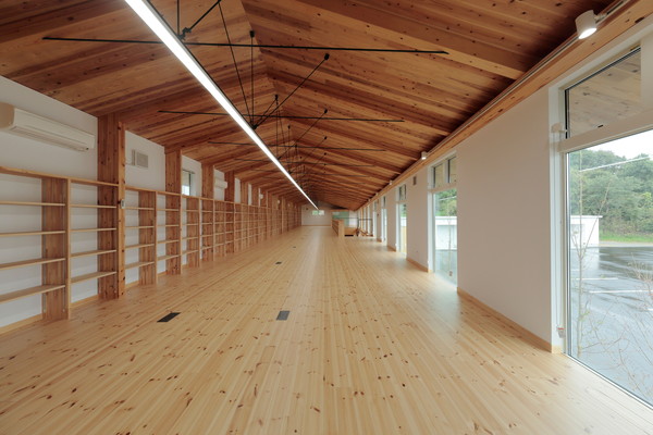 屋根を構造的に補強するスチールと照明器具を吊るすスチールがデザイン的要素となっている。