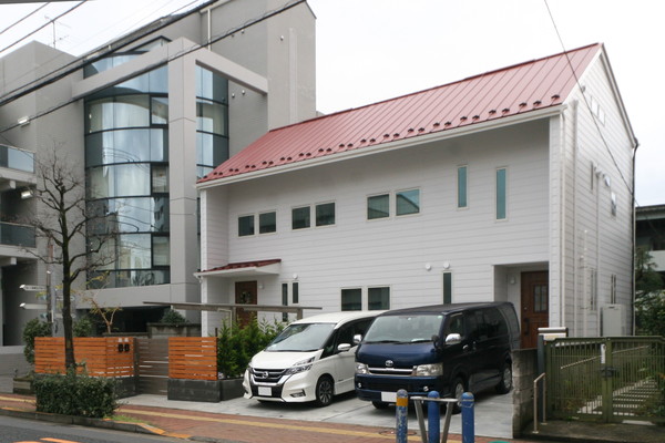 交通量の多いバス通りに面した環境に建つ二世帯住宅。