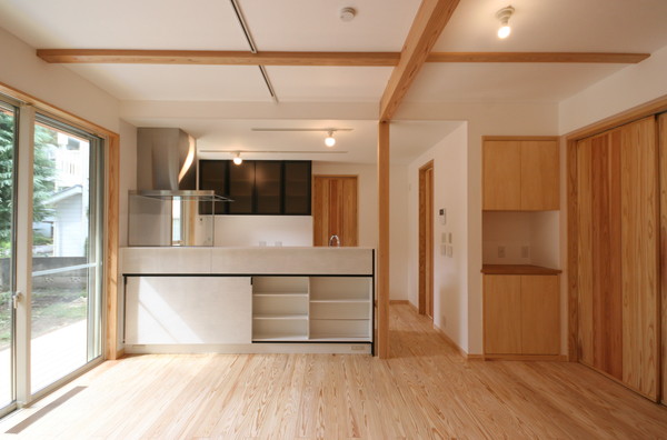 床は無垢杉板、壁は漆喰塗り、天井は土佐クロス貼り仕上げ。